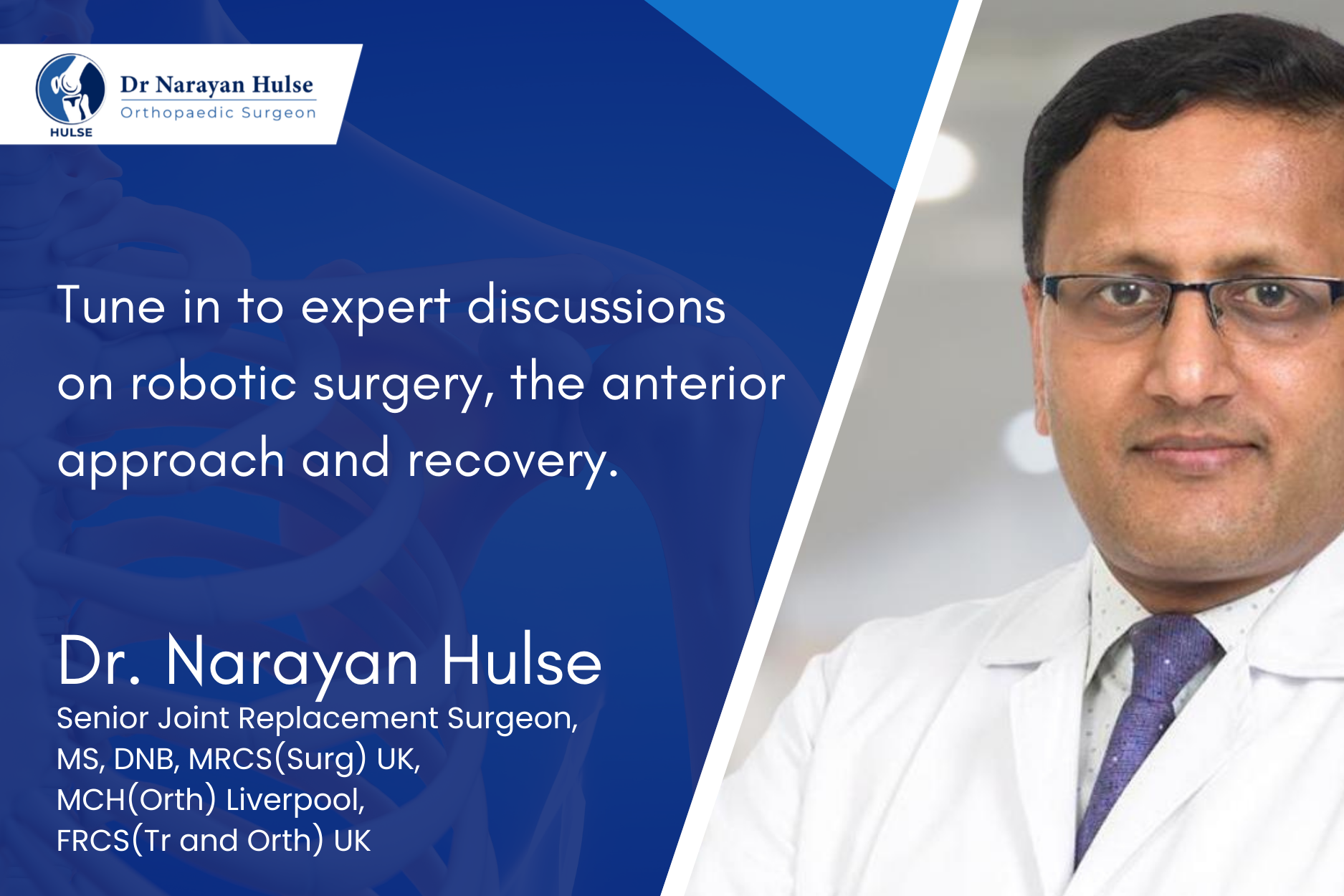 In this episode, Dr. Narayan Hulse discusses cartilage care, robotic knee replacement, and minimally invasive direct anterior hip replacement. He highlights how these advanced techniques help patients recover faster and reflect India’s growing role in the global orthopaedic revolution.